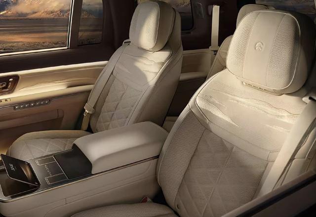 内饰方面,蔚来ES9以豪华与科技为核心,采用环抱式座舱设计,大面积采用Nappa真皮、枫影真木饰板包裹,搭配“千里江山”刺绣与“风生水起”音响罩,将东方意境与现代工艺完美融合。核心配备15.6英寸AMOLED悬浮中控屏,搭载SkyOS·天枢整车全域操作系统,操作流畅顺滑,同时配备Skyline天际线屏幕,主副驾两侧均可显示车辆信息。部分版本还配备14.5英寸全景互联行政屏,彰显行政旗舰格调。